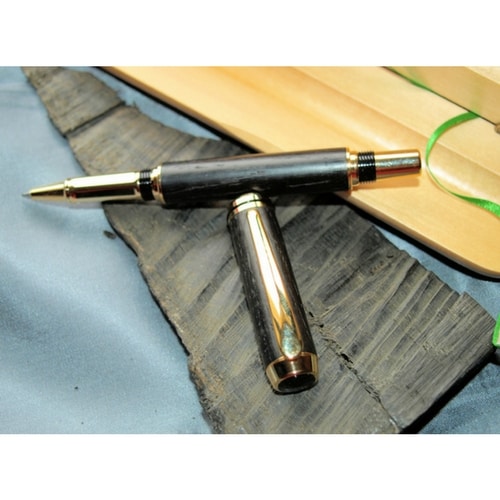 This superior Gold Plated Bog Oak Rollerball Pen has a classic screw top lid which conveniently screws onto the bottom of the pen when in use giving the writer the feeling of a firm balance as well as it looking good. The Bog Land of Ireland and Fermanagh (where this Bog Oak originates) are a vast treasure trove for a unique ancient material which only enhances the precious metals it is combined it with.